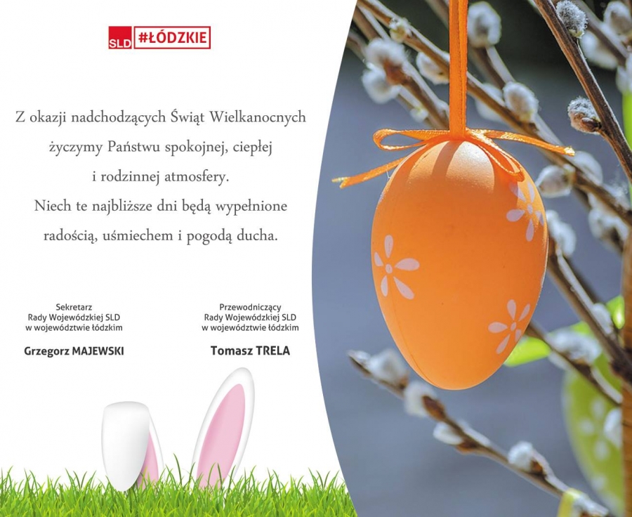 Z okazji zbliżających się Świąt Wielkanocnych, wszystkim mieszkańcom województwa łódzkiego, w imieniu Sojuszu Lewicy Demokratycznej w województwie łódzkim, życzenia złożyli przewodniczący SLD w województwie łódzkim Tomasz Trela i sekretarz wojewódzki SLD w województwie łódzkim Grzegorz Majewski.
